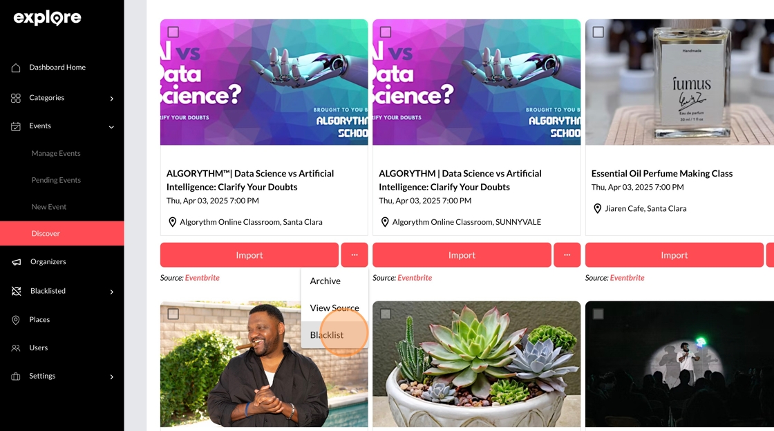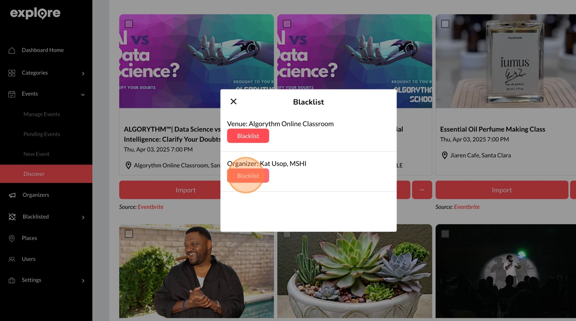 Blacklisting means that none of their future events will appear in your Discover Feed, helping you maintain a more relevant and curated feed of event content. This is especially useful for filtering out spammy, off-topic, or repetitive submissions.
