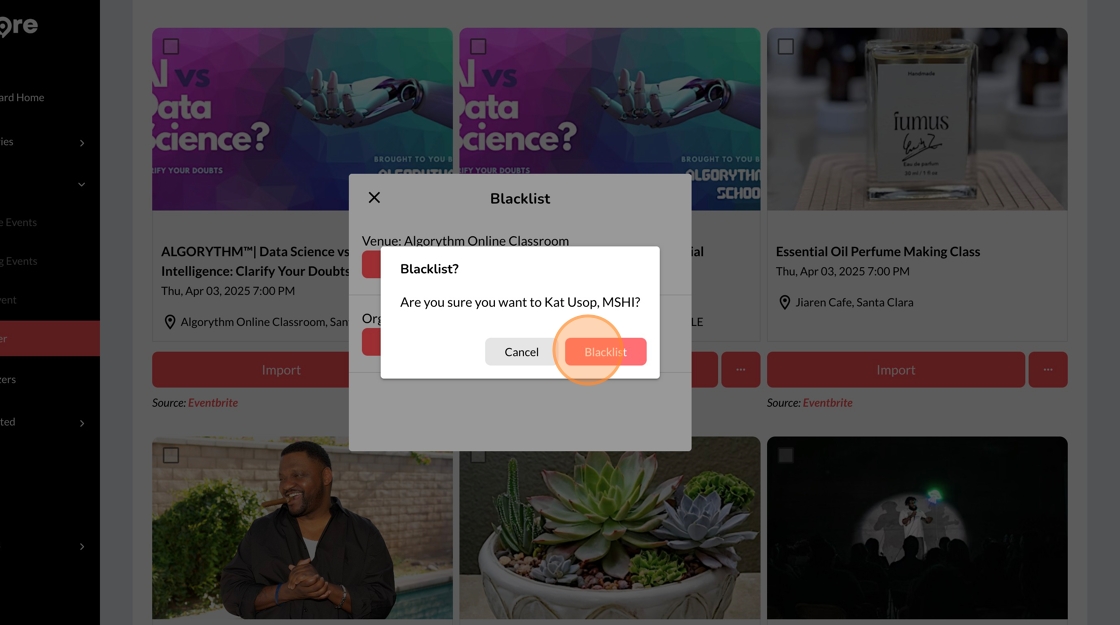 3. Locate an event by the organizer that you wish to blacklist and click ...