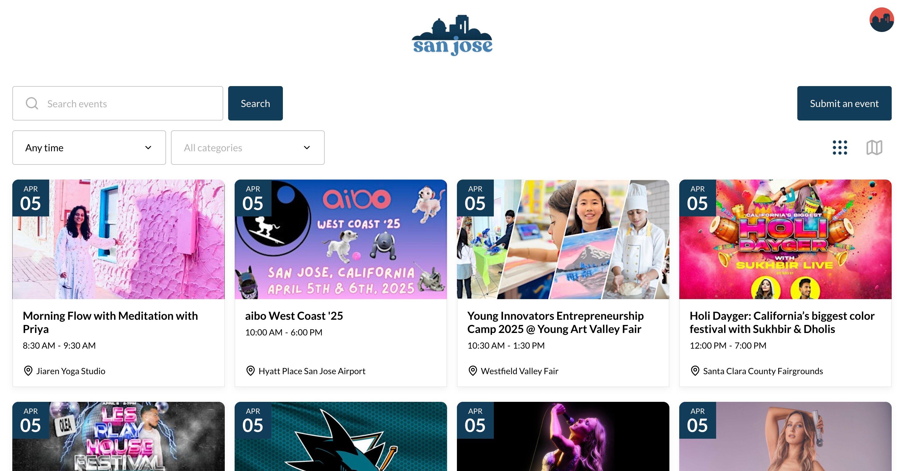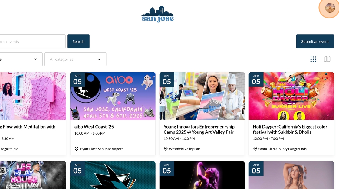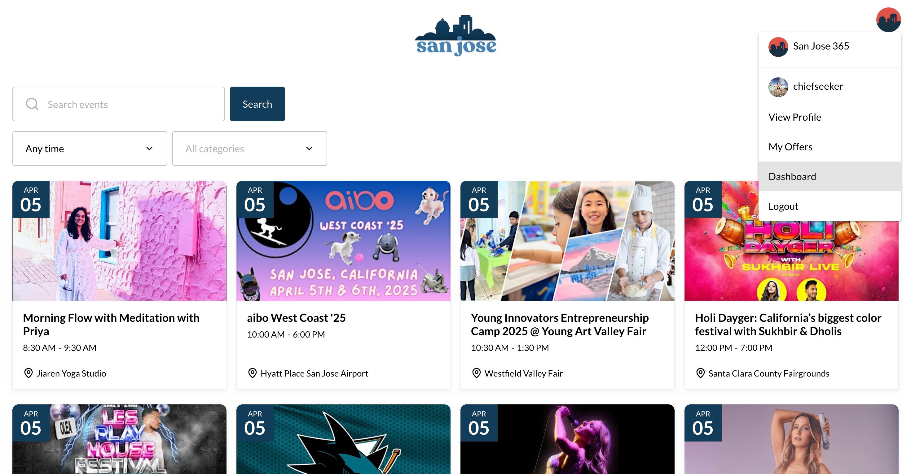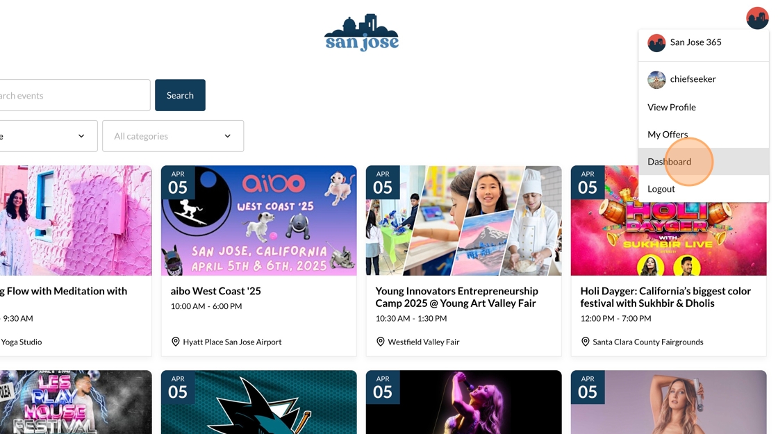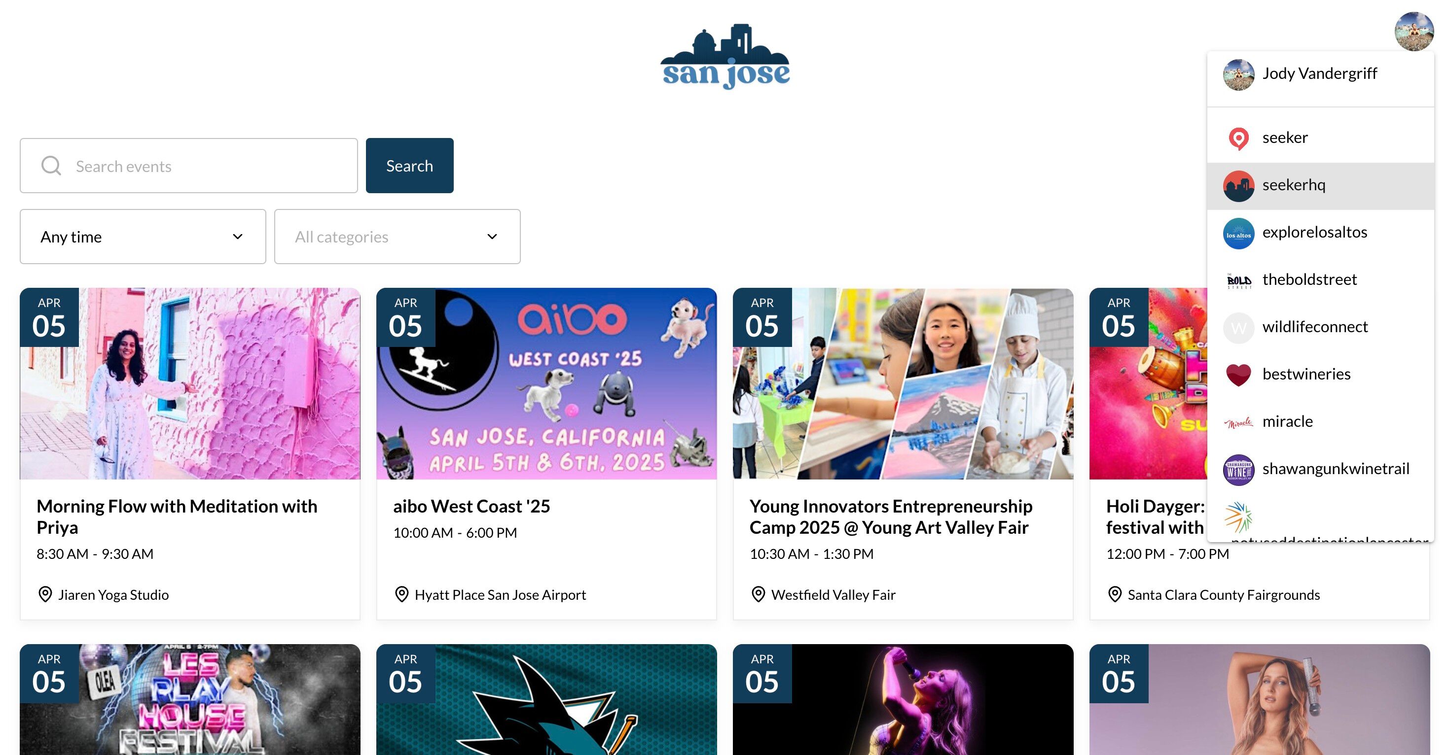 The Seeker dashboard is your organization’s main control center. From here, you can discover events through the Discover Feed, manage your own events and categories, and approve submitted events from community members or partners.