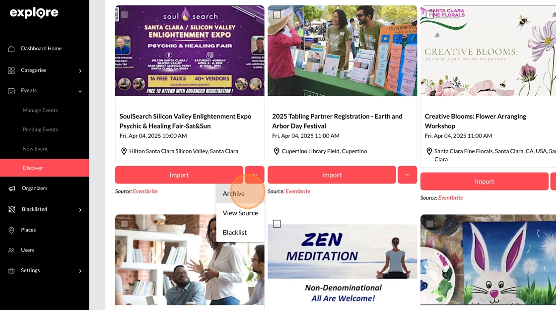 Archiving is a way to permanently remove an event from view in your Discover Feed. Archived events are hidden from the main feed, but they’re still accessible if you ever want to pull them back in the future. This helps declutter your feed while keeping your options open.